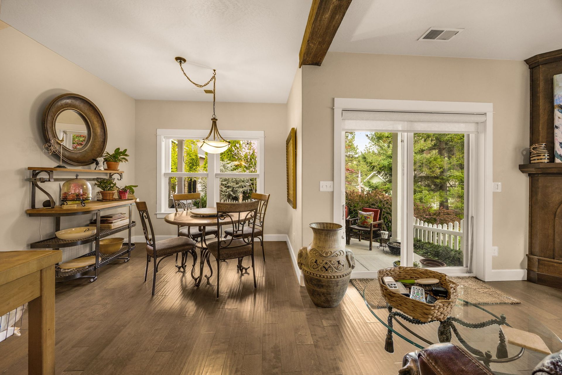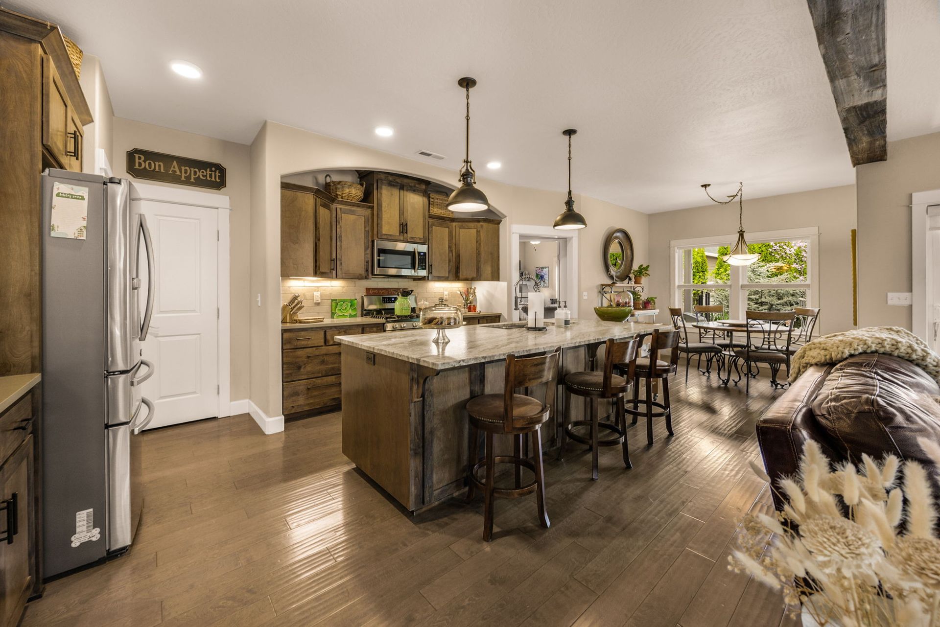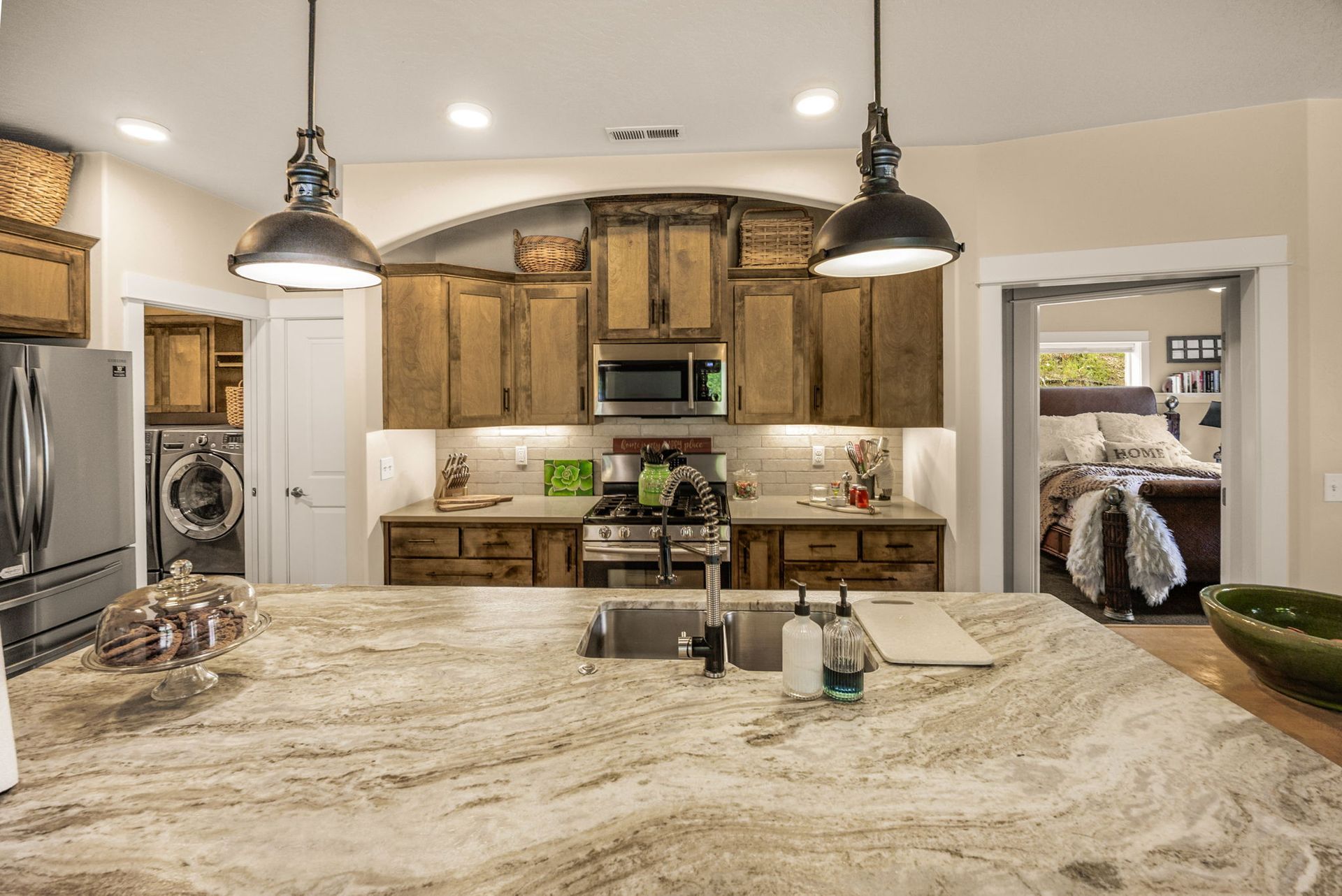 NEW PRICE! The open main living areas feature engineered wood floors, exposed beams, a cozy gas fireplace, and a chef’s kitchen equipped with a new dishwasher, granite counters, a 6-burner gas range, striking leathered granite, and an expansive dining bar. The main-level primary suite offers a spa-like retreat with dual sinks, an oversized shower, and a generous walk-in closet. A versatile office/4th bedroom, half bath, and a convenient laundry/mudroom complete the main floor. Upstairs are two spacious bedrooms and a full bath, plus an attached 2-car garage. Step outside to the inviting front porch or relax on the covered back patio—ideal for soaking up the tranquility of this peaceful setting.