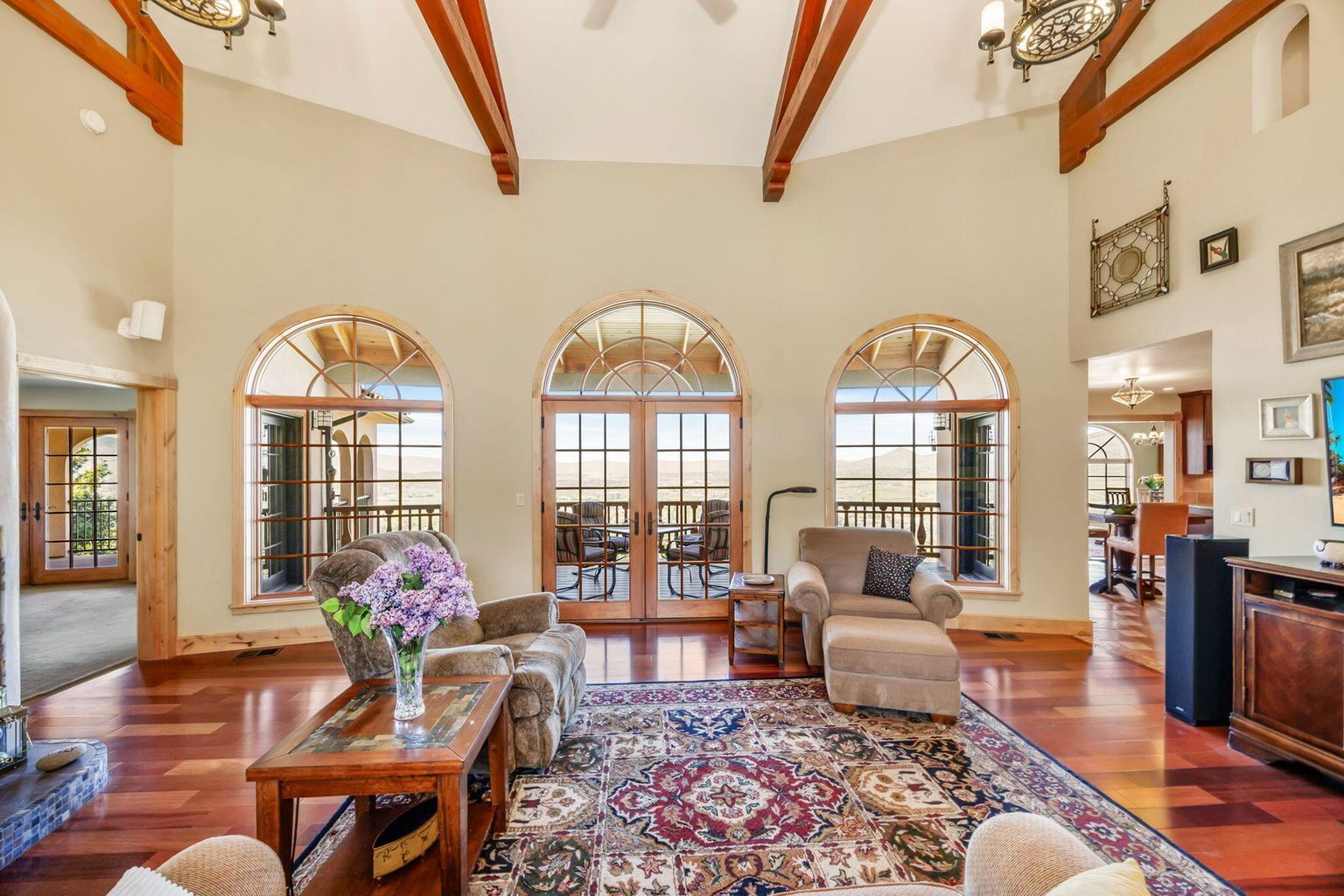 This may be the best view you will ever see! Astounding vistas stretch across the Rogue Valley, beyond the Table Rocks to the Western Cascades. Experience end-of-road privacy on this 25+ acre estate. This luxury residence presents an old-world charm that is warm and inviting, designed for comfort and sophistication. The home features soaring beamed ceilings, a stone fireplace, Ironwood cherry floors, walls of windows that extend to the expansive veranda with arched portals that frame the forever view. Large chef's kitchen with Viking Professional range, granite counters, large island and dining bar, and formal and informal dining. Beautiful wood detailing features hemlock and knotty alder. Main level primary opens to the veranda. 4 bedrooms, 4 baths, total of 4,593 SF. Spacious art room/office plus large workshop. 3-car garage. Whether you're hosting gatherings or enjoying peaceful solitude, this home delivers with style, space and serenity -- all in a setting that captures the very best of high-end living.
