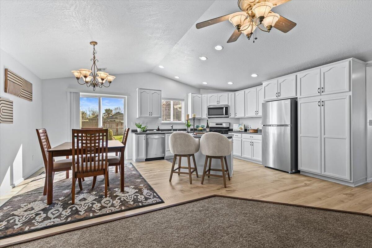 You will love this single-level Craftsman-style home in the desirable Hidden Springs neighborhood in East Medford. A welcoming front porch leads into a light-filled interior with vaulted ceilings and spacious main living areas. Large windows fill the home with natural light, while the gas fireplace with tile surround and cherry-toned cabinetry creates a warm, inviting focal point. The living room flows seamlessly into the dining area and kitchen, both with rich hardwood flooring. The kitchen features a breakfast bar, stainless dishwasher, gas range, and corner sink overlooking the easy-care yard and patio. The primary suite offers a walk-in closet, ensuite bath, and oversized step-in shower. Two additional guest rooms and a full second bath are generously sized. Two-car garage with alley access and pull-down storage. Quiet location close to shopping, dining, and Asante Medical Center. steel