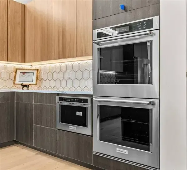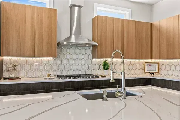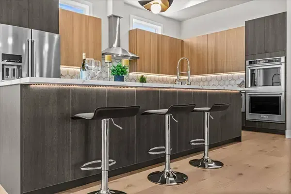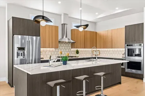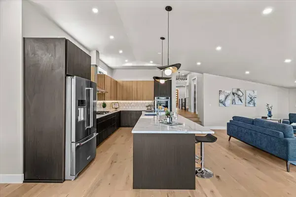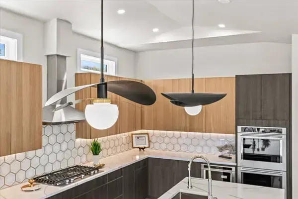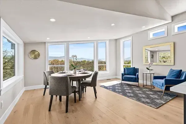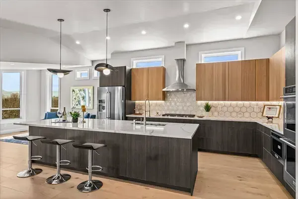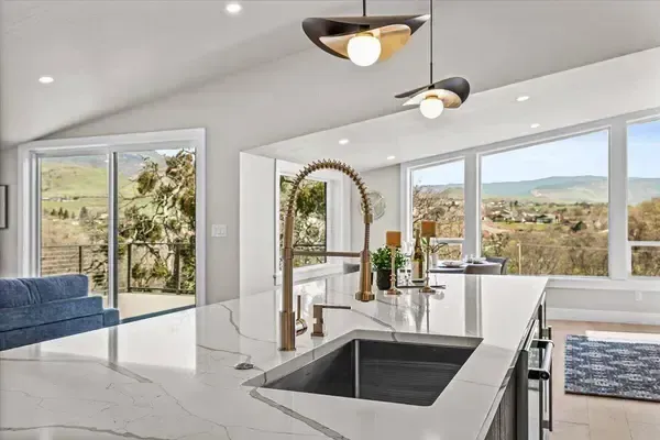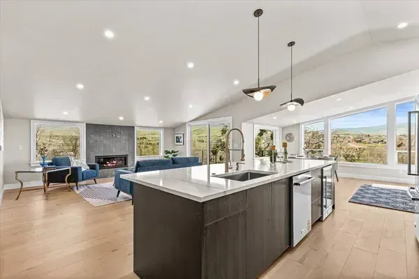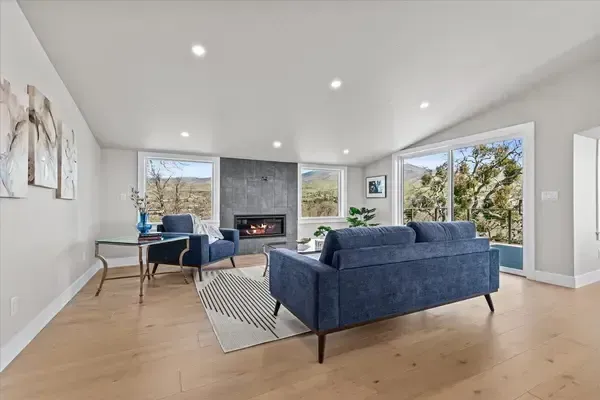 Platinum Earth Advantage home just minutes from downtown, offering 2,750 sq ft of thoughtfully designed 4BR, 3BA + office living space with stunning views of Grizzly Peak and the Cascades. This light-filled residence features 12' ceilings, expansive windows, quartz surfaces, designer lighting, and blonde wide-plank hardwood floors. The main level features two ensuite bedrooms, highlighted by a luxurious primary suite with radiant heated floors, dual shower system, and two walk-in closets. The chef's kitchen boasts an 11-ft island, double ovens, gas cooktop, beverage fridge, and walk-in pantry. Enjoy seamless indoor-outdoor living with an 8' slider to a spacious view deck. Lower level offers 2 bedrooms, office, second laundry, and potential for separate living. Professionally landscaped, private setting with detached 2-car garage, EV charging, and energy-efficient 2-zone HVAC system. Home designed by Vadim Agakhanov.