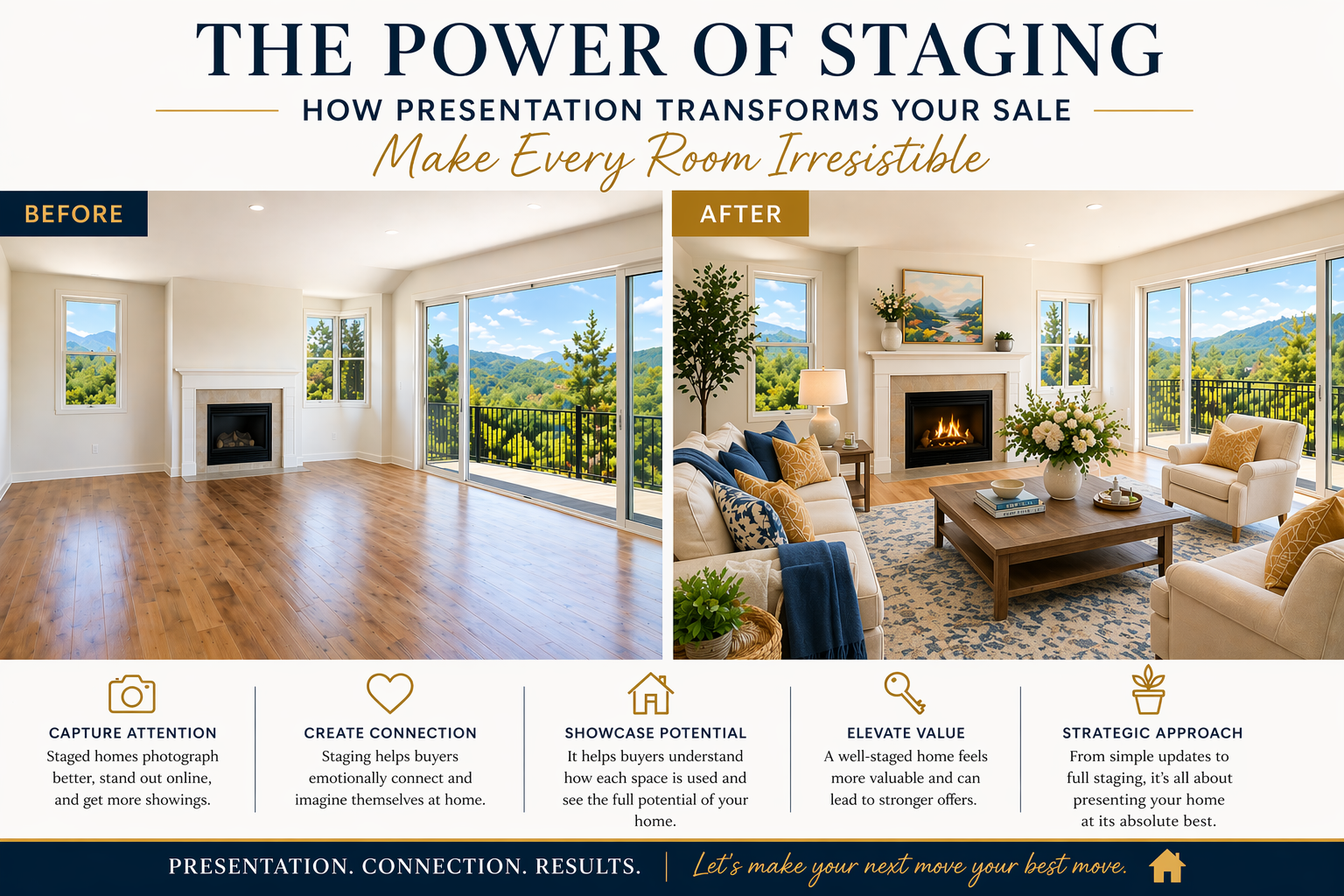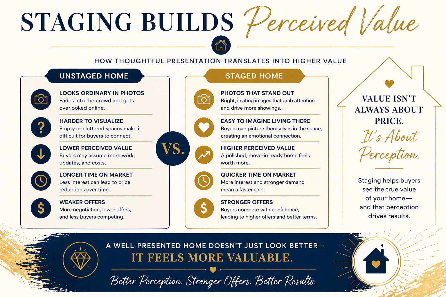 In today’s market, first impressions almost always happen online. Buyers are scrolling listings on their phones, often making split-second decisions about which homes are worth seeing in person. A well-staged home photographs brighter, warmer, and more inviting, immediately drawing attention and increasing the likelihood of clicks and showings. Staging isn’t simply about decorating—it’s about presenting your home in a way that captures interest from the very first glance.`